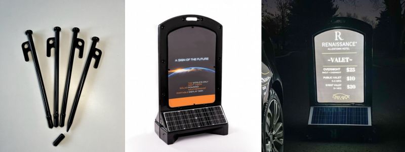 The SunSign charges its maintenance-free battery best in direct sunlight with its two mounted solar panels. In case of overcast days where the solar panels may not recharge the battery to its capacity, an AC charger is also provided with each sign for an additional charging option. Side mounted roller wheels ensure easy transportation and anchor stakes are included for semi-permanent installations or for extra sign security. Two 1.8mm RMMA blank inserts are included to take to your local print shop for graphics. Cling type sign materials may also be used for quick sign changes. The SunSign is perfect for outdoor parking lots and garages, hospitals, business parks, stadiums, sports arenas, concert venues and more!