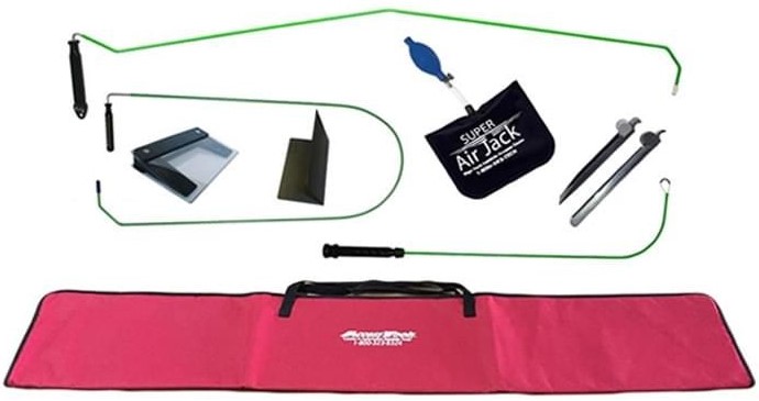 For starters, the Standard Lock-Out Kit (also known as the One Hand Jack Kit) is the most basic and cost-effective version. This kit includes all the rudimentary tools to unlock a car door including an air-jack wedge, air jack plate, one-hand jack, strap tool and a long reach tool.