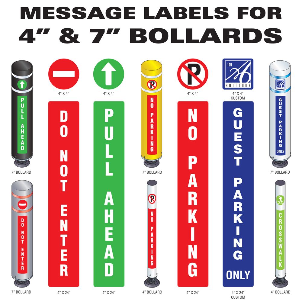 Message Bollards are a great way to both clean up unsightly concrete or metal bollards while also displaying relevant information through colorful artwork adhered to the front or back of HDPE Bollard sleeves. Available in 5” or 7” diameters with pre-made designs as well as the option for custom labeling, the Message Bollard Covers can be configured to fit any application. The option for the message bollards to be applied to Gorilla Post Magnetic, Quick Release, Fixed, and Drivable bases, increasing the capability of this great product.