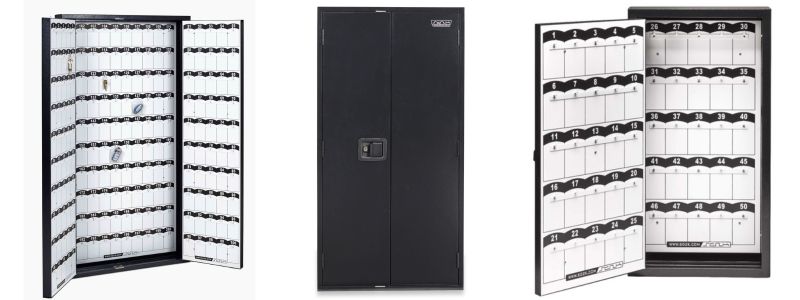 Key Boxes are available in many shapes and sizes including 30, 50, 60, 100, 120 or 200 hook Cabinets or Boxes. Most have a Cam Lock but some have a Digital Lock option. For the tech-savvy, modern operator you may lean towards the KeyCafe© SmartBox; a smart-phone controlled key box with a 7-inch touchscreen that is easily expandable to fit any size business. Weather resistant with a battery backup, this box is strong enough for all applications.