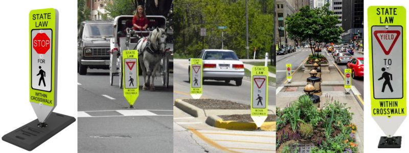In-Street Pedestrian Crosswalk Signs assists in alerting distracted drivers of pedestrian crossing zones. Motorists are given a visual cue with high visibility at mid-street crossings or non-signal intersections. Standing tall at 47” H with the ability to yield fully upon impact, this innovative design makes maintenance cost efficient and easy. It’s also resistant to damage from ozone, UV light and hydrocarbons. It’s up to MUTCD standards! With four sign designs and three base choices, there is bound to be one that fits your needs.